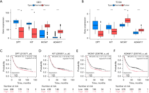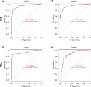 The expression analysis revealed that DPT and KIT were significantly downregulated in the gastric cancer tissues compared to the normal tissues in both the GEO and TCGA cohorts (P<0.001), while MCM7 and ADAM17 were significantly upregulated (P<0.001) (Figure 4A,4B). The Kaplan-Meier analysis showed that MCM7 (P=0.006) and ADAM17 (P<0.001) expression was associated with worse overall survival, while DPT and KIT had no significant prognostic value (P>0.05) (Figure 4C-4F). The ROC curve analysis showed that MCM7 and ADAM17 had AUCs above 0.85 in both the GEO and TCGA datasets, indicating strong diagnostic performance (Figure 5A-5D).