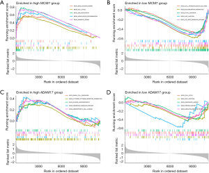 A GSEA was the performed to investigate the functional implications of MCM7 and ADAM17 expression in EGC. In the MCM7 high-expression group, the significantly enriched KEGG pathways included base excision repair, cell cycle, DNA replication, homologous recombination, and mismatch repair, indicating a heightened activity of pathways related to cell proliferation and DNA repair (Figure 6A). Conversely, the MCM7 low-expression group was enriched in pathways such as cell adhesion molecules (CAMs), extracellular matrix (ECM)-receptor interaction, focal adhesion, gap junction, and the transforming growth factor-beta (TGF-beta) signaling pathway, suggesting the potential suppression or reduced activity of adhesion and signaling pathways (Figure 6B).