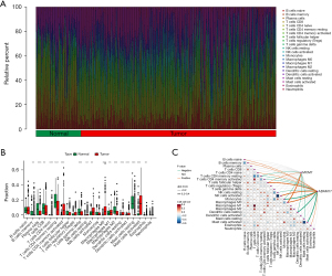 Further, the correlation between the key genes and immune cell populations was analyzed. Expression data from the tumor samples were matched to the CIBERSORT matrix, excluding cell types with zero variance. Spearman’s correlation coefficients and P values were calculated to assess associations, which were categorized based on significance and correlation strength. Correlation networks between the genes and immune cells were visualized using the linkET package (https://cran.r-project.org/web/packages/linkET/index.html).