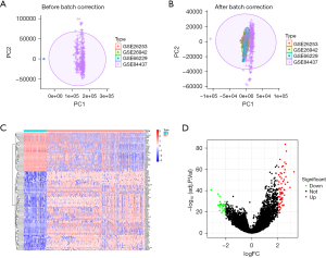 After extracting the transcriptomic profiles of the stage I–II samples from each of the four GEO datasets, the batch effects were corrected using the “ComBat” function in R package sva (https://bioconductor.org/packages/release/bioc/html/sva.html). The corrected datasets were merged into a combined cohort, comprising 100 normal and 434 tumor tissue samples, for further analysis. A principal component analysis (PCA) was conducted before and after batch correction to assess data distribution. DEGs were identified using the limma package (https://bioconductor.org/packages/release/bioc/html/limma.html) based on the following filtering criteria: |log fold change (FC)| >2 and false discovery rate (FDR) <0.05.