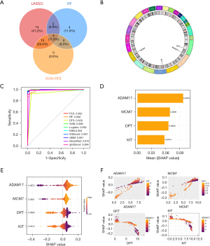 A diagnostic model was constructed using the intersecting feature genes. Multiple algorithms, including SVM, RF, and LASSO regression, were evaluated via fivefold cross-validation. All the models had high AUC values; the best-performing model was SVM, which had an AUC of 0.998 (sensitivity =96.5%, specificity =95.2%) (Figure 3C). A SHAP analysis was then conducted to interpret the model predictions. The SHAP bar plots showed that ADAM17 contributed the most to model classification, followed by MCM7, DPT, and KIT (Figure 3D). The SHAP bee-swarm and scatter plots further showed the directional effects of gene expression on model predictions (Figure 3E,3F).