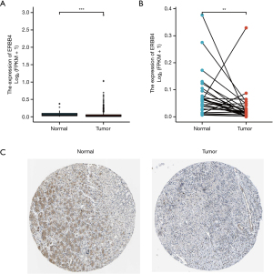 ERBB4, a member of the EGFR family, is crucial for normal tissue development, especially in the heart, nervous system, and breast system (14). However, its role in cancer is debatable. Most studies have reported that ERBB4 is abnormally expressed in various malignant tumors, including lung cancer (15), breast cancer (16), malignant melanoma (17), and ovarian cancer (18). Due to its dual effects on tumor development and progression, ERBB4 can function as both an oncogene and tumor suppressor (19). According to a study, ERBB4 is lowly expressed in invasive tumors, and slows tumor growth in breast and liver cancer, but plays a promoting role in GC and melanoma (14). In this study, we analyzed RNA-sequencing data from TCGA database, and compared ERBB4 expression in GC and adjacent non-cancerous tissues. The results showed that the ERBB4 expression level was down-regulated in the GC tissues compared with the adjacent non-cancerous tissues. These results were also verified by the immunohistochemical staining data obtained from the HPA database. Chen et al. previously sequenced 294 GC samples, and discovered ERBB4 gene mutations in GC patients (20). ERBB4 participates in cell proliferation, Ras protein signaling transduction, mitogen-activated protein kinase signaling, transmembrane receptor protein tyrosine kinase signaling, endothelial growth factor receptor signaling, and insulin receptor signaling pathways (14).