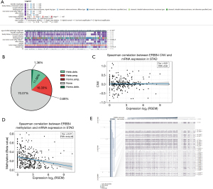 The relationship between ERBB4 gene methylation and stomach adenocarcinoma (STAD) was visualized using MEXPRESS (http://mexpress.be) based on TCGA data (13). A Spearman correlation analysis was conducted to examine the correlation between ERBB4 messenger RNA (mRNA) expression and copy number variations (CNVs). Analyses were also conducted to examine the association between the methylation level of the ERBB4 gene promoter region and ERBB4 mRNA expression, and the association between the CNVs and ERBB4 mRNA expression in the ERBB4-STAD cohort.