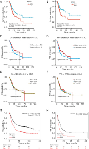 Given the negative correlation between DNA methylation and ERBB4 expression, we examined the relationship between ERBB4 methylation and patient prognosis. The results showed that the GC patients in the ERBB4 hypermethylation group had higher OS and PFS than those in the hypomethylation group, indicating that the patients in ERBB4 hypermethylation group had a better prognosis (Figure 3C,3D). The relationship between ERBB4 CNVs and patient prognosis was also analyzed; however, no significant differences in OS and PFS among the ERBB4 deletion, ERBB4 amplification, and adjacent non-cancerous groups of GC patients were found (Figure 3E,3F).