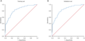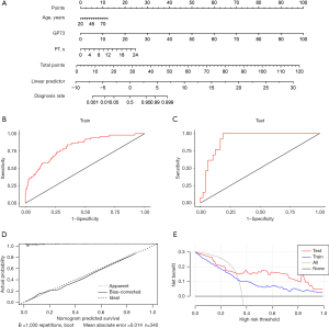 Based on the results of LASSO analysis, a nomogram model including 290 non-HCC and 50 HCC patients was established (Figure 4A), so called training cohort. In this model, each variable was assigned a score based on a point scale. The individual scores could be added together to obtain a total score. By projecting the total score onto a lower score scale, the probability of early HCC occurrence was determined. For example, age =70 years, GP73 =20, PT =10 seconds. The sum of these scores was 49, which indicated a probability of 99% for early HCC occurrence. The calibration curve results of the model showed a strong consistency between the predicted incidence and the actual incidence, demonstrating the effectiveness of the nomogram model in diagnosing liver cancer. The corrected C-indexes for the training cohort and validation cohort were 0.812 and 0.918, respectively. The 95% confidence interval for the training cohort was (0.749, 0.875) (P<0.001). The AUC values for early liver cancer diagnosis in both the training and validation cohorts were greater than 0.7, indicating that the nomogram had good discriminative power (Figure 4B,4C).