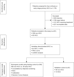 Patients diagnosed with liver cirrhosis or liver cancer were recruited from Beijing You’an Hospital, Capital Medical University from January 2023 to October 2024 (Figure 1). The criterion for inclusion in the non-liver cancer group was a diagnosis of liver cirrhosis. The criteria for the liver cancer group were as follows: (I) histologically confirmed HCC and defined as early HCC, that is, presenting as a single tumor >2 cm in diameter or three nodules <3 cm, with good health status and Child-Pugh class A or B (19); and (II) no secondary malignant tumors. Exclusion criteria were as follows: (I) patients with concurrent infections of the respiratory system, urinary system, skin and soft tissues, or other sites; (II) patients with heart, kidney or other organ failure; (III) previously diagnosed HCC patients who received radiotherapy, chemotherapy, or targeted immunotherapy; (IV) patients with incomplete clinical data. After screening, 401 patients included 338 in the non-liver cancer group and 63 in the liver cancer group were finally analyzed in the study. The sample size was determined based on feasibility and previous studies to ensure adequate power for logistic regression and model validation.