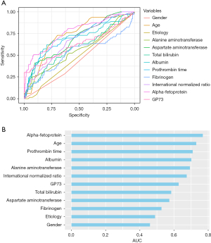 Circulating levels of AST, TBIL, ALB, PT, and INR were significantly increased in HCC patients compared those without HCC (P<0.05 for all). By contrast, plasma levels of ALB were 10.3% lower in HCC patients than patients in non-HCC group (P<0.0001). Fib levels were similar between two groups (P=0.50). For cancer biomarkers, AFP and GP73 levels were 2.59- and 1.28-fold higher in HCC group than non-HCC group (P<0.05 for both).