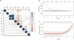 To improve the diagnostic efficacy and avoid multicollinearity, LASSO analysis was used to further analyze the above variables (Figure 3A-3C). By Spearman correlation analysis, a strong correlation was found between ALT and AST (correlation coefficient r=0.9), while AFP and GP73 had weak collinearity (r=0.1) in the entire population (n=401). Age (β=3.35), GP73 (β=7.98), etiology (β=−0.12), AST (β=2.74), ALB (β=−2.17), PT (β=4.77), Fib (β=2.83), and AFP (β=4.05) had non-zero coefficients and were considered potential factors for early liver cancer diagnosis (Figure 3A).