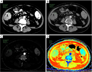 The first and second generation SDCT (Iqon Spectral CT, Spectral CT 7500; Philips Healthcare, Best, The Netherlands) conducted a contrast-enhanced CT scan of the whole abdomen. Patients were instructed to fast for 4–6 hours before the CT test, with the scanning range extending from the dome of the diaphragm to the inferior boundary of the pubic symphysis. Scanning parameters: tube voltage 120 kV, automated tube current control technology, collimator width 64×0.625 mm, matrix 512×512, scanning slice thickness 10 mm, reconstruction slice thickness 1 mm. Ioversol (320 mg I/mL) was administered into the median cubital vein using a high-pressure syringe at a dosage of 1.25 mL/kg and a flow rate of 2.5–3.5 mL/s. The automated monitoring of the abdominal aorta was used for improved scanning, with the trigger threshold established at 120 Hounsfield unit (HU). The venous phase scan commenced 30 seconds after the conclusion of the arterial phase scan.