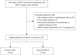 This single-center retrospective diagnostic study consecutively enrolled patients with pathologically confirmed CRC between July 2023 and July 2024. The study was conducted in accordance with the Declaration of Helsinki and its subsequent amendments. This retrospective study was approved by the Medical Ethics Review Board of the First Hospital of Lanzhou University (No. LDYYLL-2024-795), and the need for informed consent was waived owing to the retrospective nature of the study. All patients underwent preoperative SDCT scans. Two pathologists independently assessed TB grade in a blinded manner, with imaging analysis and pathological evaluation performed independently. The group included 36 men and 38 females, with a mean age of 61.16 (±13.08) years. The criteria for inclusion were as follows: (I) all patients obtained a spectral CT scan within 1 week before to surgery; (II) patients with CRC were verified by postoperative pathology, and the grade of TB was assessed; (III) comprehensive clinical data were available. Exclusion criteria: (I) inadequate clinical and CT data; (II) unsatisfactory picture quality due to significant motion or respiratory artifacts, rendering post-processing unfeasible; (III) prior administration of targeted treatment, radiation, or chemotherapy; (IV) tumor visibility on CT images poor enough to draw a region of interest (ROI). Patients were categorized into Group A (Bd1, n=22) and Group B (Bd2 + Bd3, n=52) according on TB grade. Figure 1 shows the patient selection process.
