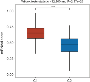Cancer stem cells (CSCs) play a pivotal role in the processes of tumorigenesis, recurrence, and metastasis, and are key contributors to both resistance to chemotherapy and the re-emergence of cancer. The CSC scores of the patients classified as C1 in the TCGA-COAD cohort were markedly elevated compared to those classified as C2 (Figure 5).