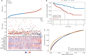Using this gene signature, the patients from the TCGA-COAD cohort were stratified into low- and high-risk groups (Figure 6A). The overall survival analysis indicated that the patients in the low-risk group had superior survival outcomes compared to those in the high-risk group (HR: 3.489; 95% CI: 2.212–5.504; P=7.78e−08; Figure 6B). In addition, the efficacy of the prognostic model was evaluated via a receiver operating characteristic curve analysis, which revealed area under the curve values of 0.698 for 1 year, 0.699 for 3 years, and 0.73 for 5 years (Figure 6C). These findings indicate that the proposed model possesses a commendable prognostic capability.
