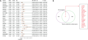 To investigate the significance of the prognostic genes in COAD, a univariate Cox regression analysis was conducted to identify the genes associated with prognosis in patients from the TCGA-COAD cohort. This analysis identified a total of 597 genes with prognostic relevance in COAD; the top 20 prognostic genes are shown in Figure 1A. Additionally, we further examined the genes associated with taurine metabolism that showed prognostic potential in COAD. The taurine metabolism-related genes identified are presented in Figure 1B and include HSPB1, NOS2, LEP, KPNA2, SERPINA1, NR1H2, ENO2, HSPA1A, TRPV1, GSR, ALOX12, GABRD, TERT, CLCN3, AGMAT, NOTCH3, and MYB.