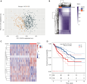 A total of 454 patients were included in the NMF clustering analysis, which was predicated on the comprehensiveness of the clinical data available. Using the expression profiles associated with the taurine metabolism-related genes from TCGA, the NMF algorithm effectively categorized the patients into two distinct expression patterns: cluster 1 (C1), which comprised 335 individuals, and cluster 2 (C2), which comprised 119 individuals. To assess the transcriptional profiles of these two inflammatory subtypes, a PCA was performed (Figure 2A). As Figure 2B shows, the clustering at k=2 exhibited a pronounced delineation between the two subtypes, indicating a substantial level of explanatory power and interpretability of the clustering, characterized by markedly high intra-cluster correlation and notably low inter-cluster correlation. Additionally, a heatmap revealed a distinct separation in the gene expression profiles of the 13 taurine metabolism-related genes between the two groups of patients from the TCGA-COAD cohort (Figure 2C). Notably, the statistically significant difference indicated that the patients in C1 had improved overall survival compared to those in C2 [hazard ratio (HR): 0.465; 95% confidence interval (CI): 0.312–0.692; P<0.001; Figure 2D].
