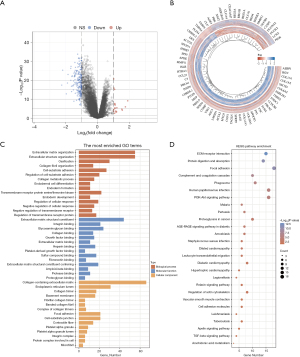 To further examine the biological processes of the 218 DEGs, GO and KEGG enrichment analyses were conducted. The results of the GO analysis for the biological processes indicated that these DEGs were predominantly involved in extracellular matrix (ECM) organization, extracellular structure organization, ossification, collagen fibril organization, cell-substrate adhesion, regulation of cell-substrate adhesion, collagen metabolic processes, endodermal cell differentiation, and endoderm formation (Figure 3C).