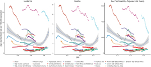 • In this study, the estimated annual percentage change was used to assess changes in age-standardized incidence, mortality, and disability-adjusted life years rates, and the relationship between disease burden and sociodemographic indices was further analyzed. Bayesian age-period-cohort modeling was used to predict trends over the 14 years following 2021.