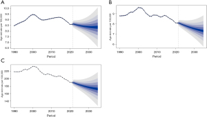 The calculation of EAPC was based on a generalized linear regression model with the following formula: Y=α+βX+ε, where Y is the natural logarithm of the ASR, α is the intercept, β is the linear trend, X is the calendar year, and ε is the error term that accounts for the random variation in the model. EAPC along with its 95% confidence interval (CI) was determined with the following formula: EAPC=100×(eβ−1). The CIs are presented in parentheses following the EAPC values. A lower limit of both EAPC and its CI being positive indicates an upward trend in ASR; conversely, an upper limit of both EAPC and its CI being negative indicates a downward trend in ASR; finally, if neither of the above two conditions is satisfied, the trend of ASR change is considered to be stable. The direct relationship between ASR and SDI was assessed via Spearman correlation. The Bayesian age-period-cohort model (BAPC) incorporating integrated nested Laplace approximation (INLA) provides extensive coverage and good accuracy in parameter estimation (14,15). Based on this, we used the BAPC to predict and analyze the future trend of liver cancer attributable to HBV disease burden among the middle-aged and older adult population. All the statistical analyses and visualizations of data were realized via packages in R software version 4.4.2 (The R Foundation for Statistical Computing).