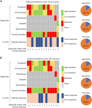 Similarly, 10 cases were excluded in further comparisons due to the lack of clinical efficacy evaluation. A total of 14 cases were included for clinical efficacy prediction, all of which were advanced GI malignancies with malignant ascites. The treatment regimens for these cases adhered to the National Comprehensive Cancer Network (NCCN) guidelines for standard therapy in advanced-stage disease (30,31). Specifically, gastric cancer patients received either the XELOX or SOX regimen, colorectal cancer patients were treated with the XELOX regimen, the peritoneal cancer patient received single-agent pemetrexed chemotherapy, and the gallbladder cancer patient was treated with the GP regimen. Each MADO sample was subjected to single-agent drug screening, yielding one of three possible results: high-sensitive, low-sensitive, or resistant. According to the K2 Oncology organoid database analysis, a dual-drug regimen was classified as sensitive only if at least one of the two drugs tested was high-sensitive in the organoid model; otherwise, the MADO model was considered resistant to the regimen.