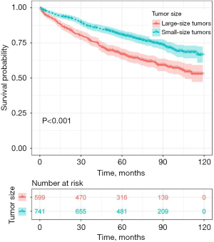 A total of 1,340 EGC patients who had undergone surgical treatment were retrieved from the SEER database. According to the patients’ tumor diameters and survival rates, the X-tile software was used to determine that 20 mm was the optimal cut-off point for tumor size, as shown in Figure 2. Based on this cut-off point, the patients were divided into two groups: the small-size tumors (SST) group, which consisted of 741 patients (55.3%) with a tumor diameter ≤20 mm, and the large-size tumors (LST) group, which included 599 patients (44.7%) with a tumor diameter >20 mm. The 5-year survival rates of the two groups were 64.9% and 52.8%, respectively, with statistical significance (P<0.001). as shown in Figure 3. The clinical and pathological data of both groups are presented in Table 1.