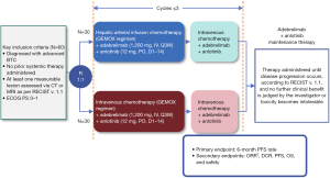 With the advent of immunotherapy, ICIs have come to represent a new paradigm for cancer treatment. They function by activating a patient’s own T lymphocytes to restore or enhance antitumor immune responses. ICIs have already seen widespread clinical adoption owing to their ability to mediate tumor cell killing (13-17). Research on CC has also involved extensive investigations into immunotherapy combined with chemotherapy. For instance, the TOPAZ-1 trial—a double-blind, placebo-controlled, phase III study—randomized participants to receive either durvalumab or placebo, with both arms receiving GC in combination (3); the median follow-up durations reached 23.4 and 22.4 months, respectively. The updated survival data indicated a 24% reduction in mortality risk with durvalumab as compared to placebo; additionally, the mOS increased to 12.9 months in the durvalumab arm, in contrast to 11.3 months in chemotherapy-alone arm (4). Within 2 years, the number of surviving patients in the combination group was than double that of the chemotherapy-alone group (23.6% vs. 11.5%). Combination chemotherapy with durvalumab continues to be well tolerated. Moreover, 60.9% of patients in the durvalumab group and 63.5% in the chemotherapy-alone group experienced grade 3 or 4 TRAEs. The rate of treatment discontinuation due to TRAEs did not increase with durvalumab combination (8.9%) in comparison to that of chemotherapy alone (11.4%). Another representative trial, KEYNOTE-966, followed up patients for a median of 25.6 months. Pembrolizumab plus GC as first-line therapy for advanced BTC achieved an mOS of 12.7 (11.5–13.6) months, while that of placebo plus GC was 10.9 (9.9–11.6) months. The incidence rate of grade 3–4 AEs was 79% in the treatment group and 75% in the control group (5). These two studies firmly validate the survival benefit that immunotherapy offers to patients diagnosed with CC. However, the OS yielded by combined immunotherapy was less than 2 months, which is unsatisfactory. Moreover, it appears that durvalumab (targeting PD-L1) demonstrates a potential safety advantage over pembrolizumab (targeting PD-1) given the rates of grade 3 or 4 AEs. Adebrelimab, a recombinant humanized IgG4 anti-PD-L1 antibody developed by Jiangsu Hengrui, was therefore selected as the immunotherapeutic partner in our study.