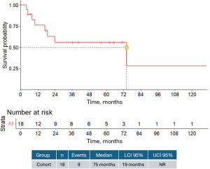 The first survival curve estimated the OS of the entire cohort without stratification by covariates. The analysis was performed using the Kaplan-Meier method, which appropriately accounts for censored patients who had not experienced the event (death) by the end of the study period. In total, 18 patients were included, with nine observed events (deaths). The median OS was 75 months, with a 95% confidence interval (CI) ranging from 19 months to not reached (NR).