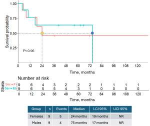 The second survival curve stratified the cohort by sex to explore potential differences in survival outcomes between male and female patients. This stratification provides a more nuanced assessment of how sex influences OS. Among female patients (n=9), there were five events, with a median OS of 24 months (95% CI: 19–NR). In male patients (n=9), four events were observed, with a median OS of 75 months (95% CI: 17–NR). From a statistical perspective, the median OS of 24 months for female patients was notably shorter than the 75 months observed in males, suggesting a possible sex-based survival difference in this cohort. Although this finding is clinically relevant, statistical confirmation would require a formal test, such as the log-rank test. The confidence intervals highlight the uncertainty in these estimates: for females, the lower bound (19 months) is defined, but the upper bound is NR, while for males, the lower bound (17 months) reflects similar uncertainty despite a higher median OS.