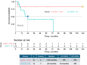 Although patients with AJCC stage IV disease demonstrated a trend toward poorer survival than those with AJCC stage II/III disease, this difference did not reach statistical significance. This observation is consistent with the unfavorable prognosis associated with advanced-stage cancers. However, the limited sample size may have reduced the statistical power, making it difficult to detect significant differences, even if they were present. Stage (AJCC IV vs. II/III): coefficient =0.06590; slope =0.02020; SE =0.0489; Z=1.350; P=0.18.