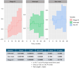 The overall model did not significantly explain the variability in the survival outcomes. The included covariates-sex and disease stage-did not fully capture the factors influencing survival in this cohort 1.82 on 2 degrees of freedom (df); P value =0.40 (Figure 7).