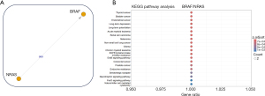 The next step in our analysis was to select four cases with varying numbers of mutated genes to explore their relationship with BRAF alterations. The first case analyzed involved only two mutated genes: BRAF and NRAS. Genomic analysis of a subset of patients with CRC harboring BRAF mutations, occasionally accompanied by NRAS alterations, revealed potential functional interactions (Figure 1A). These findings suggest the involvement of other RAF isoforms, such as A-RAF and C-RAF, which, like BRAF, are integral components of the MAPK signaling pathway (13). These isoforms may contribute to resistance mechanisms by compensating for the reduced BRAF activity, thereby diminishing the efficacy of BRAF. Similar mutational patterns and signaling compensations have been observed in other cancer types, as highlighted by the KEGG pathway analysis (Figure 1B).