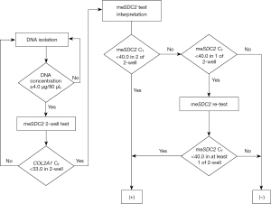 Cycle threshold (CT) values were calculated using the real-time PCR 7500 software version 2.3 (Thermo Fisher Scientific). meSDC2 was considered detected if the CT value was <40 cycles. If the CT value was not measurable, methylation was not detected. Samples were deemed positive if methylation was detected in both reactions and negative if not detected in either reaction. Test results were labelled inconclusive if methylation was detected in only one of the two reactions, prompting a retest. If methylation was detected in at least one of the retest reactions, the sample was considered positive; if the retest was negative in both reactions, the sample was considered negative. Acceptable test results required the CT value of COL2A1 to be less than 33, indicating the limit of detection for the COL2A1 gene (data not shown) in both reactions. The process of evaluating meSDC2 was schematised in Figure 1.