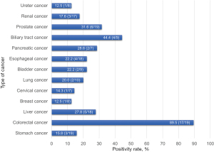 SDC2 is a protein component of the cell membrane, characteristically expressed in mesenchymal cells but not in normal intestinal epithelial cells (22). Previous clinical studies with the stool meSDC2 test demonstrated high sensitivity and specificity in diagnosing CRC (12-15). Despite the remarkable performance of this new stool-based test for CRC diagnosis, little attention has been paid to its cross-reactivity with other cancers in previous research. Only one study evaluated the positivity rate of this test in patients with gastric and liver cancers (12). Our study stands out for assessing the positivity rate of this test in 12 different non-CRC cancer types. In previous studies using neoplastic tissues, meSDC2 was found in gastric cancer (16), head and neck cancer (18), and glioma tissues (19), but to our knowledge, no research findings have addressed other types of cancer. Hence, evaluating its cross-reactivity with other types of cancer is necessary to establish stool meSDC2 as a biomarker for CRC diagnosis, which this study aimed to confirm. Our study showed a 15.8% positivity rate among patients with gastric cancer. In South Korea, the incidence of gastric cancer is relatively high, with age-standardized rates around 30–40 per 100,000 annually (23). However, due to a nationwide screening program that provides biennial upper endoscopy to individuals aged 40 years and older, more than 60% of newly diagnosed gastric cancers are detected at stage I (21,24). Consistent with this, 14 of 18 included gastric cancer patients in our study had stage I disease. Given this low prevalence and predominance of early-stage cancer, the expected positive rate of stool testing due to gastric cancer is estimated to be well below 1 per 10,000 individuals, and thus is not anticipated to significantly impact the application of the stool meSDC2 test in CRC screening.