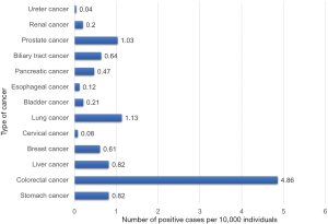 Expected positive rate of stool meSDC2 test per 10,000 persons by cancer type