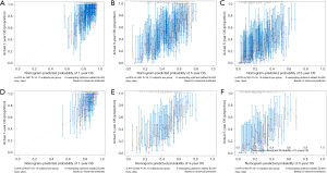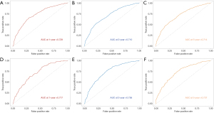 The nomogram integrated these 10 variables to predict 1-, 3-, and 5-year OS (Figure 3). Discrimination was robust, with AUCs of 0.729 (95% CI: 0.699–0.758), 0.710 (95% CI: 0.689–0.731), and 0.714 (95% CI: 0.691–0.738) for 1-, 3-, and 5-year OS in the training cohort, respectively (Figure 4A-4C). Validation cohort AUCs were 0.717 (95% CI: 0.675–0.759), 0.736 (95% CI: 0.704–0.768), and 0.737 (95% CI: 0.702–0.772) (Figure 4D-4F). Calibration curves demonstrated close alignment between predicted and observed survival probabilities (Figure 5). Internal validation via bootstrap resampling showed minimal optimism in the C-index (training cohort: 0.657 vs. bootstrap-corrected: 0.657), indicating model stability. Our proposed model was compared with the established prognostic discrimination models based on Fong Clinical Risk Score, Basingstoke index and TNM staging system. The C-index of each model were as follows: our model: 0.657 (training cohort), 0.660 (validation cohort), 0.657 (Bootstrap mean); Fong clinical risk score: 0.610 (training cohort), 0.658 (validation cohort), 0.609 (Bootstrap mean); Basingstoke index: 0.558 (training cohort), 0.583 (validation cohort), 0.558 (Bootstrap mean); TNM staging system: 0.629 (training cohort), 0.617 (validation cohort), 0.629 (Bootstrap mean), suggesting that our model had higher accuracy than Fong clinical risk score/Basingstoke index/TNM staging system (P<0.001, Table 3).