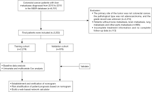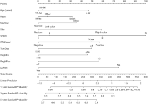 The American Joint Committee on Cancer (AJCC) tumor-node-metastasis (TNM) staging system, while foundational, inadequately captures prognostic complexity in CRCLM. It omits critical factors such as age, socioeconomic determinants, and treatment-specific variables (7). The Surveillance, Epidemiology, and End Results (SEER) database, developed by the U.S. National Cancer Institute (NCI), encompasses 18 population-based cancer registries covering nearly 30% of the U.S. population. It collects comprehensive data on thyroid, breast, gastric, colorectal, hepatic, pancreatic, lung, and bladder cancers. Beyond basic patient information, the database provides critical details on cancer classification, grade, TNM staging, lymph node metastasis, treatment modalities, chemotherapy/radiotherapy status, survival outcomes, and follow-up duration (8). Nomograms address this gap by integrating diverse predictors into visual prognostic tools, outperforming TNM staging in multiple cancers (9). This study analyzed CRCLM cases from the SEER database (2010–2015) treated with primary tumor resection and chemotherapy. We aimed to identify independent prognostic factors and develop a visual nomogram integrating demographic, pathological, and treatment variables to validate its predictive utility. We present this article in accordance with the TRIPOD reporting checklist (available at https://jgo.amegroups.com/article/view/10.21037/jgo-2025-415/rc).