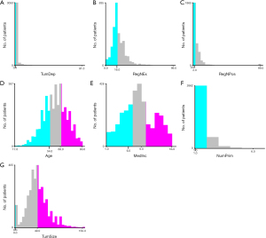- Tumor characteristics: primary site (right colon, left colon, rectum), differentiation grade, AJCC T/N stage, carcinoembryonic antigen (CEA) level, tumor deposits, number of regional lymph nodes examined, number of positive lymph nodes, tumor size, number of primary tumors, and perineural invasion.