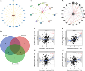 Figure 5 Analysis of protein interaction. (A) Analysis of protein interaction by BioGRID. (B) Analysis of protein interaction by STRING. (C) Analysis of protein interaction by GeneMANIA. (D) Venn diagram took the intersection of results from BioGRID, STRING and GeneMANIA. NDUFB11, RAB11A, TMX1 and UQCR10 were selected out. (E) Interaction analysis between CYSTM1 and NDUFB11. (F) Interaction analysis between CYSTM1 and RAB11A. (G) Interaction analysis between CYSTM1 and TMX1. (H) Interaction analysis between CYSTM1 and UQCR10. BioGRID, Biological General Repository for Interaction Datasets; CYSTM1, cysteine rich transmembrane module containing 1; NDUFB11, NADH:ubiquinone oxidoreductase subunit B11; RAB11A, member RAS oncogene family; TMX1, thioredoxin related transmembrane protein 1; TPM, transcripts per million; UQCR10, ubiquinol-cytochrome c reductase, complex III subunit X.