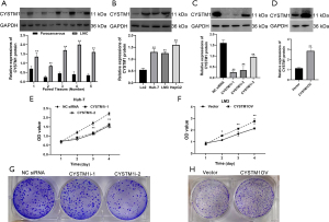 Figure 7 CYSTM1 was highly expressed in HCC tissues and promoted the proliferation of HCC cell lines. (A) CYSTM1 was highly expressed in HCC tissues. (B) CYSTM1 was highly expressed in HCC cell lines. (C) CYSTM1 siRNA transfection blocked the expression of CYSTM1 in Huh-7 cells. (D) CYSTM1 was overexpressed in Ubi-MCS-3FLAG-CBh-gcGFP-IRES-CYSTM1 infected-LM3 cells. (E) CYSTM1 silencing blocked cell proliferation in Huh-7 cells. (F) CYSTM1 overexpression promoted cell proliferation in LM3 cells. (G) CYSTM1 knockdown significantly inhibited colony formation in Huh-7 cells. (H) The overexpression of CYSTM1-overexpressed increased colony formation in LM3 cells. *, P<0.05; **, P<0.01. CYSTM1, cysteine rich transmembrane module containing 1; HCC, hepatocellular carcinoma; NC, negative control; OD, optical density; siRNA, small interfering RNA.