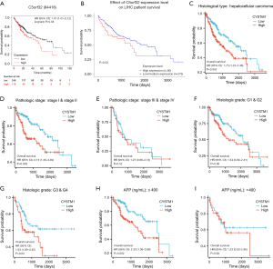 Figure 3 Prognostic analysis of CYSTM1 in HCC. (A) The prognostic analysis from KM plotter. (B) The prognostic analysis from HPA. (C-I) The prognostic analysis in HCC patients with histological type of hepatocellular carcinoma (C), pathologic stage of I & II (D), pathologic stage of III & IV (E), histologic grade of G1 & G2 (F), histologic grade of G3 & G4 (G), AFP ≤400 ng/mL (H), and AFP >400 ng/mL (I). AFP, alpha-fetoprotein; CI, confidence interval; CYSTM1, cysteine rich transmembrane module containing 1; HCC, hepatocellular carcinoma; HPA, Human Protein Atlas; HR, hazard ratio; KM, Kaplan-Meier.