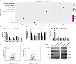 Figure 8 CYSTM1 was involved in toll-like receptor signaling pathway by modulating TLR1/TLR2 expression in HCC. (A) KEGG pathway analysis using results from high-throughput RNA-sequencing. (B) Potential genes involved in toll-like receptor signaling pathway which screened out by high-throughput RNA-sequencing. (C) The effect of CYSTM1 silencing on the mRNA levels of CYSTM1, TLR1, CXCL9, TLR2 and LY96. (D) The effect of CYSTM1 overexpression on the expression of CYSTM1, TLR1, CXCL9, TLR2 and LY96. (E) Analysis of expression correlation between CYSTM1 and TLR1 by GEPIA. (F) Analysis of expression correlation between CYSTM1 and TLR2 by GEPIA. (G) Western blot analysis of the effect of CYSTM1 knockdown or overexpression on TLR1 and TLR2 expression. *, P<0.05; **, P<0.01. CXCL9, C-X-C motif chemokine ligand 9; CYSTM1, cysteine rich transmembrane module containing 1; GEPIA, Gene Expression Profiling Interactive Analysis; HCC, hepatocellular carcinoma; KEGG, Kyoto Encyclopedia of Genes and Genomes; LY96, lymphocyte antigen 96; mRNA, messenger RNA; NC, negative control; TLR1, toll-like receptor 1; TLR2, toll-like receptor 2; TPM, transcripts per million.