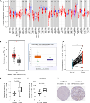 Figure 1 CYSTM1 was highly expressed in HCC than in normal liver tissues. (A) The expression difference of CYSTM1 in various tumors was analyzed using TIMER. (B) GEPIA analyzed the differential expression of CYSTM1 in HCC and normal liver tissues. (C) UALCAN analyzed the differential expression of CYSTM1 in HCC and normal liver tissues. (D) The differential expression of CYSTM1 from TCGA_HCC dataset. (E) The expression analysis of CYSTM1 from GSE87630 dataset. (F) The expression analysis of CYSTM1 from GSE84598 dataset. (G) HPA was used to verify expression of CYSTM1 in normal (image available from https://www.proteinatlas.org/ENSG00000120306-CYSTM1/tissue/liver#img) and liver cancer (image available from https://www.proteinatlas.org/ENSG00000120306-CYSTM1/cancer/liver+cancer#img) tissues. *, P<0.05; **, P<0.01; ***, P<0.001. CYSTM1, cysteine rich transmembrane module containing 1; FPKM, fragments per kilobase of transcript per million mapped reads; GEPIA, Gene Expression Profiling Interactive Analysis; HCC, hepatocellular carcinoma; HPA, Human Protein Atlas; mRNA, messenger ribonucleic acid; TCGA, The Cancer Genome Atlas; TIMER, Tumor Immune Estimation Resource; TPM, transcripts per million; UALCAN, University of ALabama at Birmingham CANcer data analysis Portal.