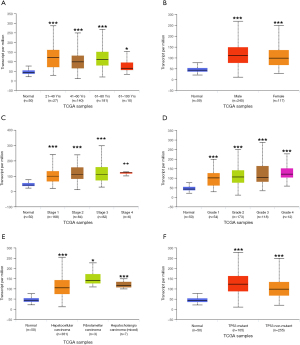 Figure 2 The expression analysis of CYSTM1 based on different clinicopathologic features in HCC by UALCAN. The expression of CYSTM1 in HCC based on age (A), gender (B), individual cancer stages (C), tumor grade (D), histological subtypes (E) and TP53 mutation status (F). *, P<0.05; **, P<0.01; ***, P<0.001. CYSTM1, cysteine rich transmembrane module containing 1; HCC, hepatocellular carcinoma; TCGA, The Cancer Genome Atlas; TP53, tumor protein p53; UALCAN, University of ALabama at Birmingham CANcer data analysis Portal.