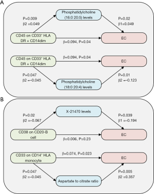 Through the two preceding steps of UVMR and targeted screening based on β, β1, and β2, we preliminarily identified two immune cell phenotype-lipid-EC pathways and two immune cell phenotype-plasma metabolite-EC pathways (Figure 9), involving two plasma metabolome and two plasma lipids. Subsequently, the MVMR analysis confirmed the independent causal effect of the aspartate to citrate (Asp/Cit) ratio on EC (MVMR-IVW P<0.05) (Table 2). The mediation analysis using the product-of-coefficients method revealed that the Asp/Cit ratio mediated 10.6% of the causal relationship between CD33+CD14+ monocytes and EC, and persisted after MVMR adjustment for confounding factors (Table 3).