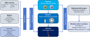 We employed a four-stage analytical framework to identify and validate immune cell-esophageal tumor pathway mediators. First, UVMR was used to establish the initial causal associations between potential mediators and EC. Mediators demonstrating statistically significant causal effects (P<0.05) were selected, and their effect sizes (β1) were quantified. Next, the causal relationships were re-evaluated through UVMR by reversing the analytical direction (i.e., the identified immune cells served as exposures, and the previously selected mediators acted as outcomes). This reciprocal analysis identified immune cells exerting significant causal effects on mediators (P<0.05), with corresponding effect sizes (β2). Following this, the mediators underwent directional consistency validation relative to the overall exposure-outcome relationship. Specifically, when the total exposure-outcome effect (β) was positive, both β₁ and β₂ had to exhibit concordant directionality (both positive or both negative). Conversely, negative total β necessitated opposing directionalities between β1 and β2. Finally, the validated mediators underwent a MVMR analysis to evaluate their independent causal effects on the outcome. The mediators with adjusted MV-IVW P values <0.05 were considered robust mediators. The final mediation analysis employed the product-of-coefficients method to calculate the mediation effect (β1×β2) and the proportion mediated [(β1×β2)/β] (35).