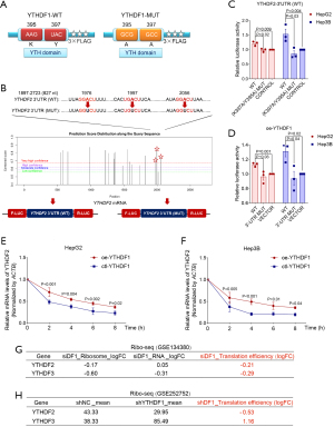 It was previously reported that YTHDF1 can influence the translation rate of targeted mRNAs (11); however, our findings revealed that YTHDF1 not only controlled the protein level of YTHDF2, but also regulated its mRNA level. In this scenario, we hypothesized that YTHDF1 may also influence mRNA stability and hence modulate the mRNA level of YTHDF2, which contradicts findings from a previous study (14). We next employed actinomycin D to suppress transcription in HepG2 and Hep3B cells that overexpressed YTHDF1 and examined the decay rate to determine the mRNA stability. The results demonstrated that the mRNA of YTHDF2 exhibited greater stability in the group with YTHDF1 overexpression compared to the control group (Figure 4E,4F). As YTHDF1 was known as an m6A reader that affects the translation rates of m6A-modified targets, we also detected the translation rates using Ribosome sequencing in Hela cells (the GSE134380 dataset) (14) and HCC-derived MHCC97H cells (the GSE252752 dataset) (31), respectively. The results indicated a reduction in the translation efficiency of YTHDF2 in both Hela and MHCC97H cells (Figure 4G,4H), further supporting the observation that YTHDF2 levels decreased following YTHDF1 interference. Overall, our findings indicate that YTHDF1 binds to the mRNA of YTHDF2 in two-way authentication and enhances its stability, thus increasing its expression in an m6A-YTHDF1-YTHDF2 axis.