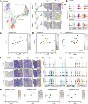 The interaction functions of correlated genes are influenced by their expression levels and spatial patterns. Nevertheless, most prior research focused on analyzing the expression levels of YTHDF paralogs in tumor and para-tumor tissues. However, the spatial localization and distribution of these paralogs in HCC tissues, specifically YTHDF1 and YTHDF2 in certain locations, have not been investigated. To this end, we utilized ST sequencing, as outlined in our prior study (21), to investigate the spatial expression patterns of these YTHDF paralogs in two various regions from one HCC sample (Figure 5A), and each region of HCC tissue consists of the carcinoma sector, the para-carcinoma sector, and the fiber cord sector. Notably, the results showed that the expression levels of YTHDF paralogs, especially YTHDF1 and YTHDF2, were increased in the carcinoma region compared to the para-carcinoma region (Figure 5A). Furthermore, they appeared to be positively associated with each other in specific tumor clusters within the tumor core region as determined by our ST data (Figure 5B). Next, we compared the correlations of spatial expressions between YTHDF paralogs and found a stronger correlation of spatial expression patterns between YTHDF1 and YTHDF2 (R=0.62, P=0.01) than that of YTHDF2 and YTHDF3 (R=0.52, P=0.047). YTHDF1 demonstrated no relevance to the spatial expression of YTHDF3, consistent with our prior findings (Figure 5C-5E). Considering the constraints of tissue samples, we further conducted a secondary data analysis on an earlier ST sequencing study on primary liver tumors (Figure 5F-5H), which included a spatial transcriptome map of three main types of liver cancer (34).