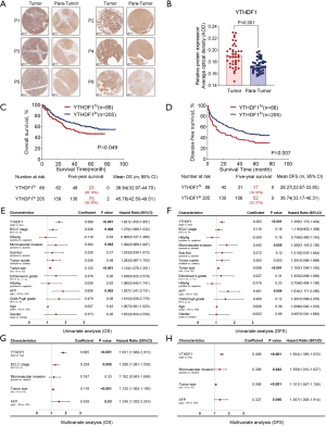 To investigate the expression of YTHDF1 in HCC, we initially assessed the protein levels of YTHDF1 in 40 pairs of HCC samples (Cohort 1) using IHC analysis, which shows a significant upregulation of YTHDF1 in tumor tissues compared to adjacent para-tumor tissues (Figure 1A,1B and Figure S1B). Subsequently, we performed Kaplan-Meier survival analysis to evaluate OS and DFS in a cohort of 293 HCC patients, considering their clinicopathologic characteristics and prognostic data, to assess the clinical significance of YTHDF1 in HCC (Cohort 2 and Table S1). Following an IHC evaluation of YTHDF1 levels in tumor tissues (Figure S1C), the optimal cutoff values were determined utilizing X-tile software (Version 3.6.1). The Kaplan-Meier survival analysis indicated a significant correlation between elevated YTHDF1 expression and reduced OS (P=0.049) and DFS (P=0.007) in patients with HCC after hepatectomy (Figure 1C,1D). The YTHDF1hi group exhibited a 5-year survival rate of 26.14% for OS and 19.32% for DFS. In contrast, the YTHDF1lo group demonstrated a 5-year survival rate of 36.59% for OS and 25.37% for DFS, indicating that elevated levels of YTHDF1 correlate with a worse prognosis in HCC patients. In addition, a univariate analysis demonstrated a substantial correlation between alpha-fetoprotein (AFP), tumor size, microvascular invasion (MVI), and YTHDF1 expression level with OS or DFS, while the Barcelona Clinic Liver Cancer (BCLC) stage was demonstrated to be exclusively associated with OS (Figure 1E,1F). Using these variables collectively, the multivariate analysis demonstrated that the expression level of YTHDF1 was an independent risk factor for OS, along with AFP, tumor size, and BCLC stage. Furthermore, the expression level of YTHDF1, together with AFP, tumor size, and MVI, were identified as independent risk factors for DFS (Figure 1G,1H). Collectively, these results suggest that the upregulation of YTHDF1 in HCC correlates with a poor prognosis for patients and may serve as an independent prognostic marker.