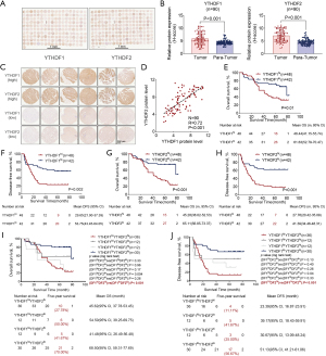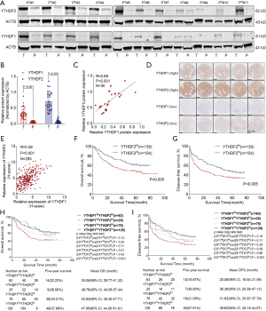 Considering the robust connections and regulatory mechanisms between YTHDF1 and YTHDF2, as well as their consistent prognostic values, we intended to explore the clinical significance of combined YTHDF1 and YTHDF2 in HCC. It was confirmed that the protein levels of YTHDF1 and YTHDF2 were substantially higher in tumor tissues than in para-tumor tissues among 30 pairs of HCC tissues (Figure 6A,6B), and a strong correlation (R=0.69, P<0.001) between the levels of YTHDF1 and YTHDF2 was observed (Figure 6C). We also detected the expression of YTHDF2 in our previous clinical tissue microarrays by immunohistochemical analysis, and the results indicated a strong correlation (R=0.56, P<0.001) between the expression of YTHDF1 and YTHDF2 in tumor sectors (Figure 6D,6E).