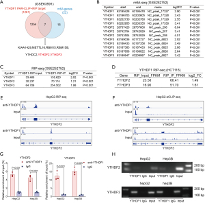 To investigate the biological correlations among YTHDF paralogs, particularly focusing on the prominent biomarker YTHDF1, we conducted an initial assessment of high-confidence targets associated with m6A modifications, specifically YTHDF paralogs, when analyzing the overlaps of targeted genes identified by photoactivatable ribonucleoside crosslinking and immunoprecipitation (PAR-CLIP) and RIP sequencing of YTHDF1 in Hela cells from the GSE63591 dataset (11). Notably, the results indicated that both YTHDF2 and YTHDF3 were high-reliability binding targets of YTHDF1 (Figure 2A). Further analysis of m6A sequencing and RIP sequencing in HCC-derived MHCC97H cells from the GSE252752 datasets (31), validated that YTHDF1 could bind the mRNA of YTHDF2 and YTHDF3 in an m6A-dependent manner (Figure 2B,2C). In addition, it appears that this binding capability is not particular to certain tumor types, as YTHDF1 could also bind the mRNA of YTHDF2 and YTHDF3 in colorectal cancer-derived HCT116 cells (Figure 2D). In order to verify our previous findings, we subsequently performed RIP sequencing and e-CLIP sequencing for YTHDF1 in HepG2 cells, and the results demonstrated noteworthy binding peaks on the mRNA of YTHDF2 and YTHDF3 as compared to the input (Figure 2E,2F), which was also verified by RIP-PCR analysis and AGE in HepG2 and Hep3B cells (Figure 2G,2H). Collectively, we initially hypothesized the regulatory mechanisms among all YTHDF paralogs and proposed that YTHDF1 has the ability to selectively bind to the mRNA of YTHDF2 and YTHDF3 in an m6A-dependent manner.