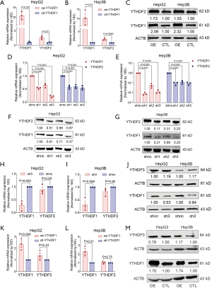To clarify the regulatory mechanisms governing the relationship between YTHDF1 and its paralogs, we analyzed the expression of YTHDF paralogs in Hep3B and HepG2 cells following transfections with YTHDF1 overexpression (oe-YTHDF1) or YTHDF1 interference (sh-YTHDF1) lentivirus. The findings revealed that the mRNA and protein levels of YTHDF2 exhibited an upsurge following YTHDF1 overexpression (Figure 3A-3C). Likewise, the mRNA and protein levels of YTHDF2 were consistently reduced following the interference with YTHDF1 in HepG2 and Hep3B cells (Figure 3D-3G). However, the expression of YTHDF3 remained unchanged regardless of the overexpression or disruption of YTHDF1 (Figure 3H-3M). To determine whether the regulatory mechanism is unique to tumor settings, we also detected the expression of YTHDF paralogs in the hepatocyte-specific Ythdf1 KO mice. Our findings showed that hepatic YTHDF1 depletion could decrease the levels of YTHDF2 but not YTHDF3 (Figure S3A-S3D). Taken together, these results indicated that YTHDF1 can influence the mRNA and protein levels of YTHDF2 rather than YTHDF3 in vitro and in vivo.