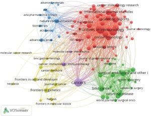 The network visualization of high-yield journals is shown in Figure 6. Table 4 details the top 15 journals by publication volume and their 2024 IFs, all of which are classified as Q1/Q2 of 2023 Journal Citation Reports (JCR), with Cancer Research having the highest IF. This can confirm the authority of these studies, and make it more convenient for researchers in related fields to understand the current research trend and effectively track the research hotspots. Cancers was the most prolific journal, publishing 229 articles on CRC and TME-related research, with a JCR classification of Q1 and an IF of 4.4, followed by Frontiers in Immunology (n=224, Q1), Frontiers in Oncology (n=207, Q2), and Scientific Reports (n=145, Q1).
